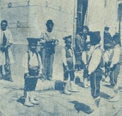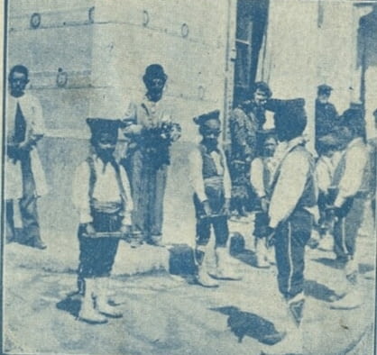 Imatge del Ball de Bastonets publicada al programa de les Festes de Sant Eloi del 1901. Al mig, el Moniqueta amb barret. El bastoner de la dreta de la foto és el Gumersindo Pascual