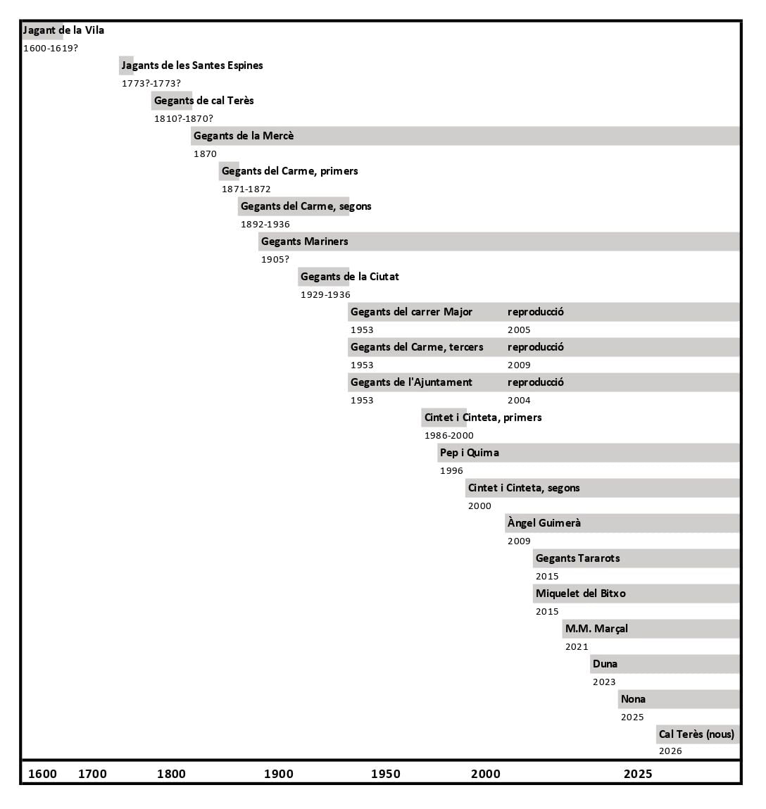 Malgrat l'existència dels dos gegants barcelonins del 1424, es considera que el primer gegant corpori amb estructura de fusta i modelatge de cap i mans amb la tècnica del cartró pedra és de l'any 1513 i de Girona. La segona figura corpòria seria la d’Olot del 1521 i la tercera de Cervera del 1551. Com veurem més endavant, el primer gegant de Tàrrega era corpori i originari del 1600. Segurament sortiran nous estudis on apareixeran noves figures, però de moment ens inclinem a pensar que el gegant targarí és el quart construït mai a Catalunya. Comencem forts! El seguiran el Drac de la Vila del 1610 i un seguici festiu que acompanyava la processó de les Santes Espines conegut des del 1773 amb la presència d’un Ball de Bastons, dos de Moros i Cristians, una nova parella de gegants i un Ball dels Valencians. També cal destacar la forta influència que han exercit les festes dels barris de la Mercè i del Carme en la creació de ballets, figures i gegants propis. Pel que fa al barri de la Mercè: els Gegants de la Mercè del 1870, els Gegants Mariners del 1907-1909?, l’Home de la Barra del 1878 i el Ball d’Arquets (cercolets) del 1882?. Pel que fa al barri del Carme: els desapareguts Gegants del Carme del 1871 i 1892, els actuals del 1953 i el Ball de Bastonets del 1879.