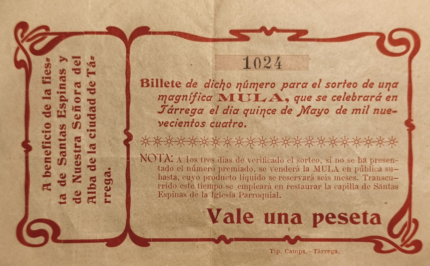 Annex 8: Val pel sorteig d’una mula pel finançament de la festa de les Santes Espines del 1904