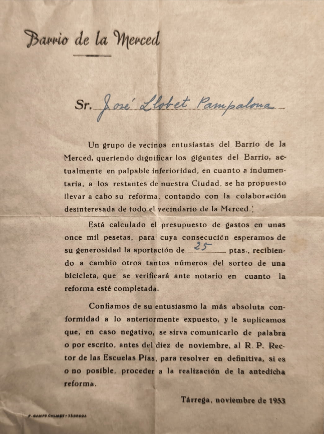 Annex 6: Butlleta dels veïns per col·laborar en la millora dels Gegants de la Mercè, emesa el novembre del 1953