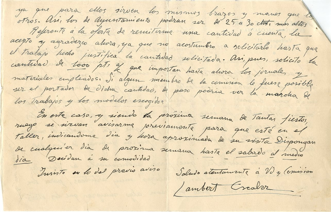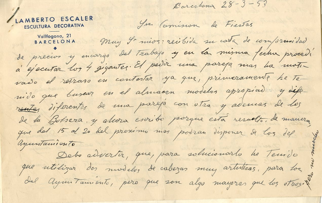 Annex 3: Anvers carta de Lambert Escaler a la Comisión Oficial de Fiestas per la compra dels Gegants del Carme i l'Ajuntament, signada el 28/03/1953