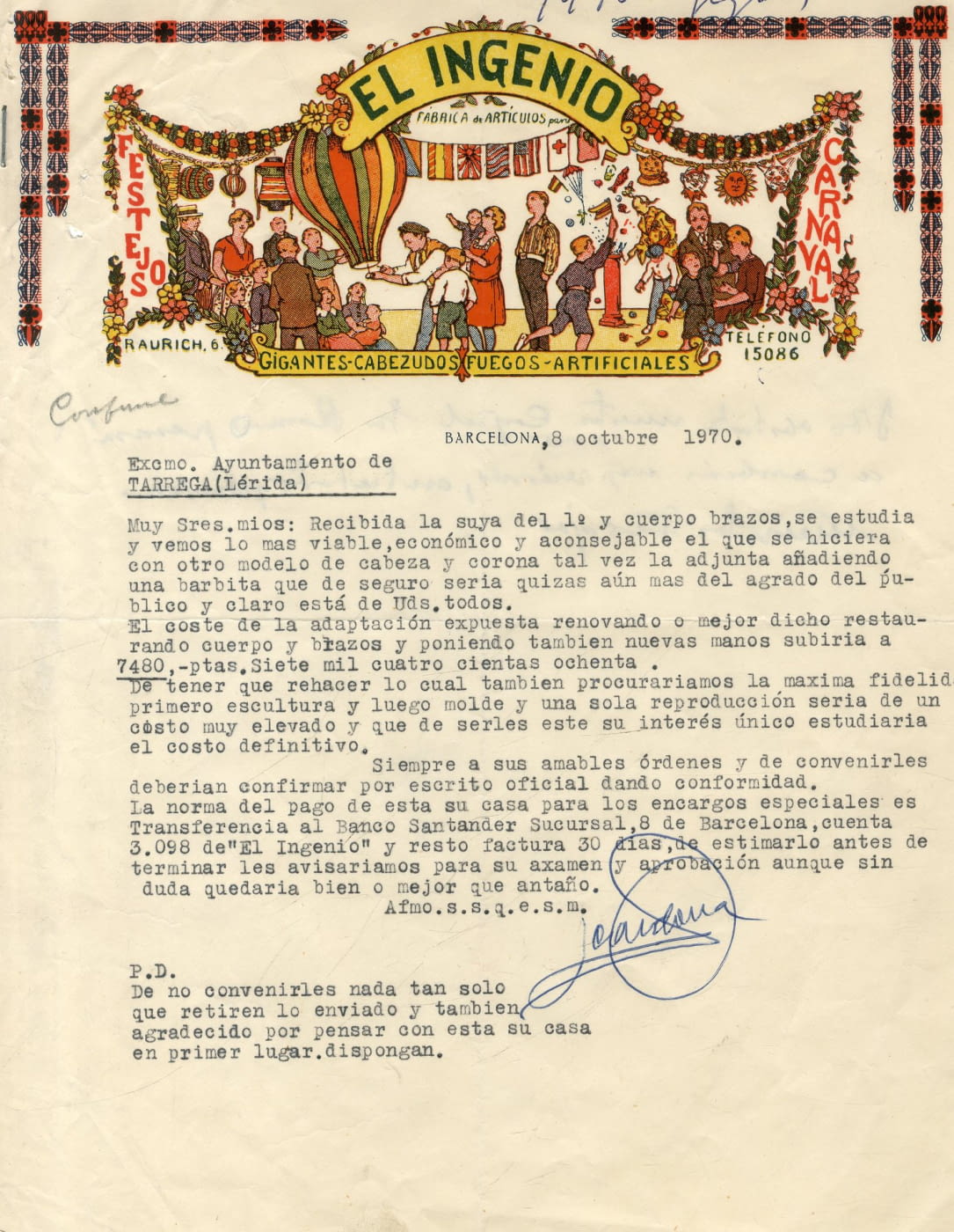 Annex 5: Carta de El Ingenio a l'Ajuntament de Tàrrega per l'adquisició del nou cap del gegant Eloi, signada el 8/10/1970